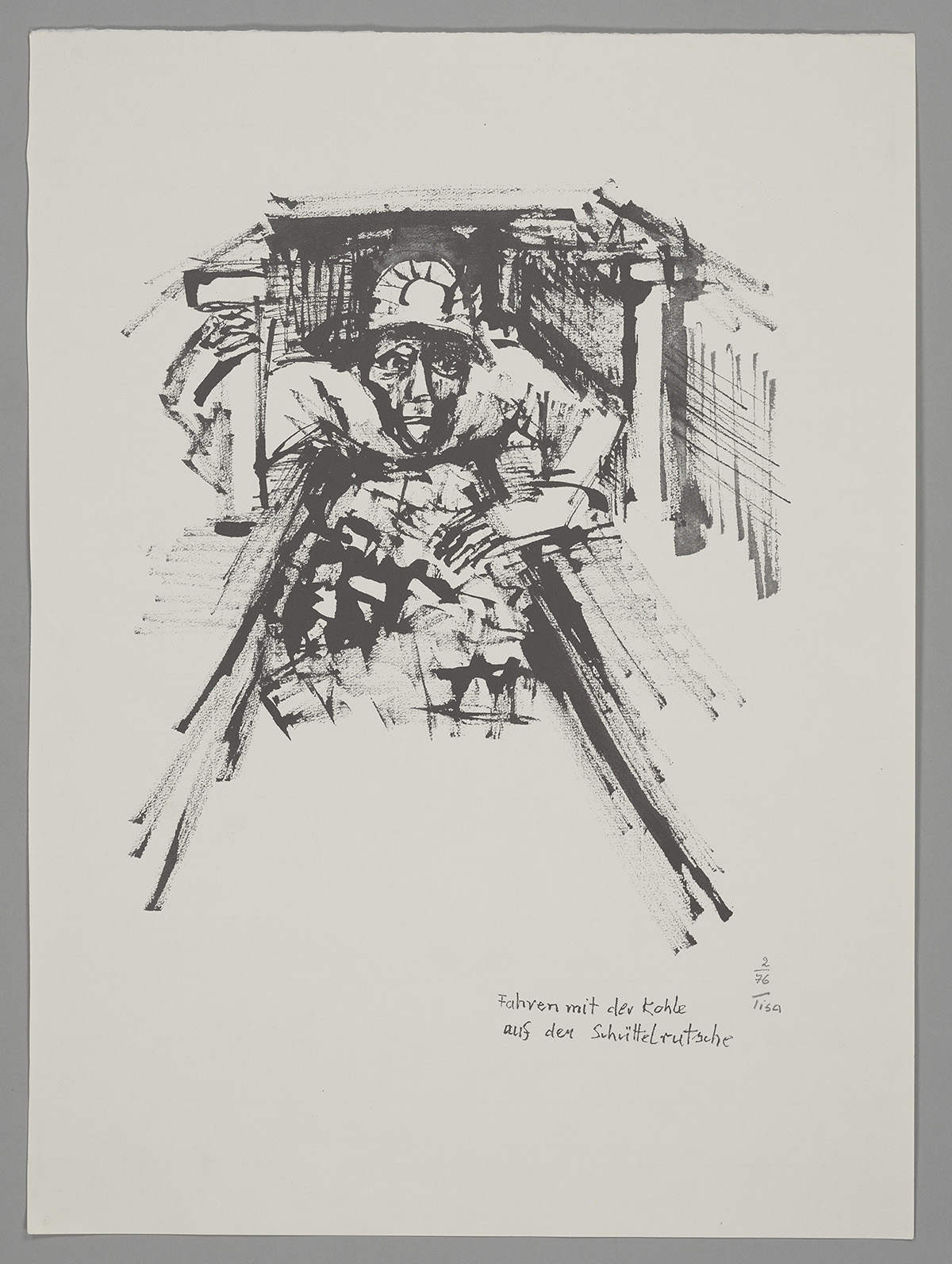 Aus ihrer Bochumer Zeit stammt auch das Motiv „Fahren mit der Kohle auf der Schüttelrutsche“ (1976). In ihrem charakteristisch expressionistischen Stil entwirft Tisa von der Schulenburg eine beklemmende Szene: Ein Mann mit Helm und Kopflampe liegt bäuchlings auf einem Förderband, das irrtümlich als Schüttelrutsche bezeichnet wurde. Den linken Arm stützt er auf, mit der rechten Hand umklammert er einen Stempel. Der Bergmann ist überproportional groß dargestellt, wodurch der Grubenraum noch enger und bedrückender wirkt. Bewegung erzeugt die Künstlerin durch eine unruhige, scheinbar regellose Strichführung, die zugleich die innere Anspannung des Dargestellten spürbar macht. Zugleich wirkt seine Erschöpfung so überwältigend, dass er gar nicht wahrnimmt, wie er sich mit der Umklammerung des Stempels bei laufendem Band in unmittelbare Lebensgefahr begibt. Tisa von der Schulenburg geht es dabei nicht um eine realistische Schilderung der Arbeit unter Tage, sondern um die Verdichtung emotionaler Eindrücke, um Kräfteverschleiß, Beklemmung und Isolation in einer unwirtlichen, unsicheren Umgebung.
