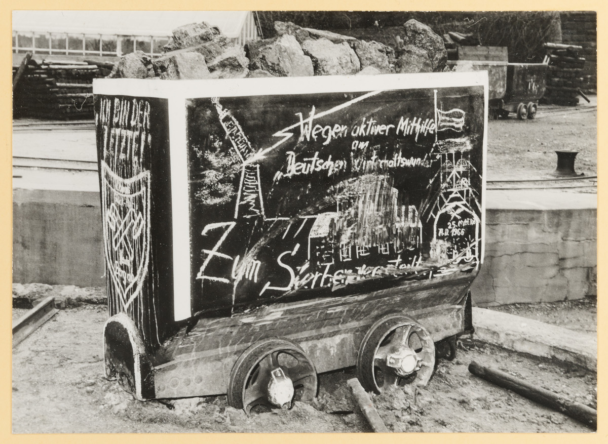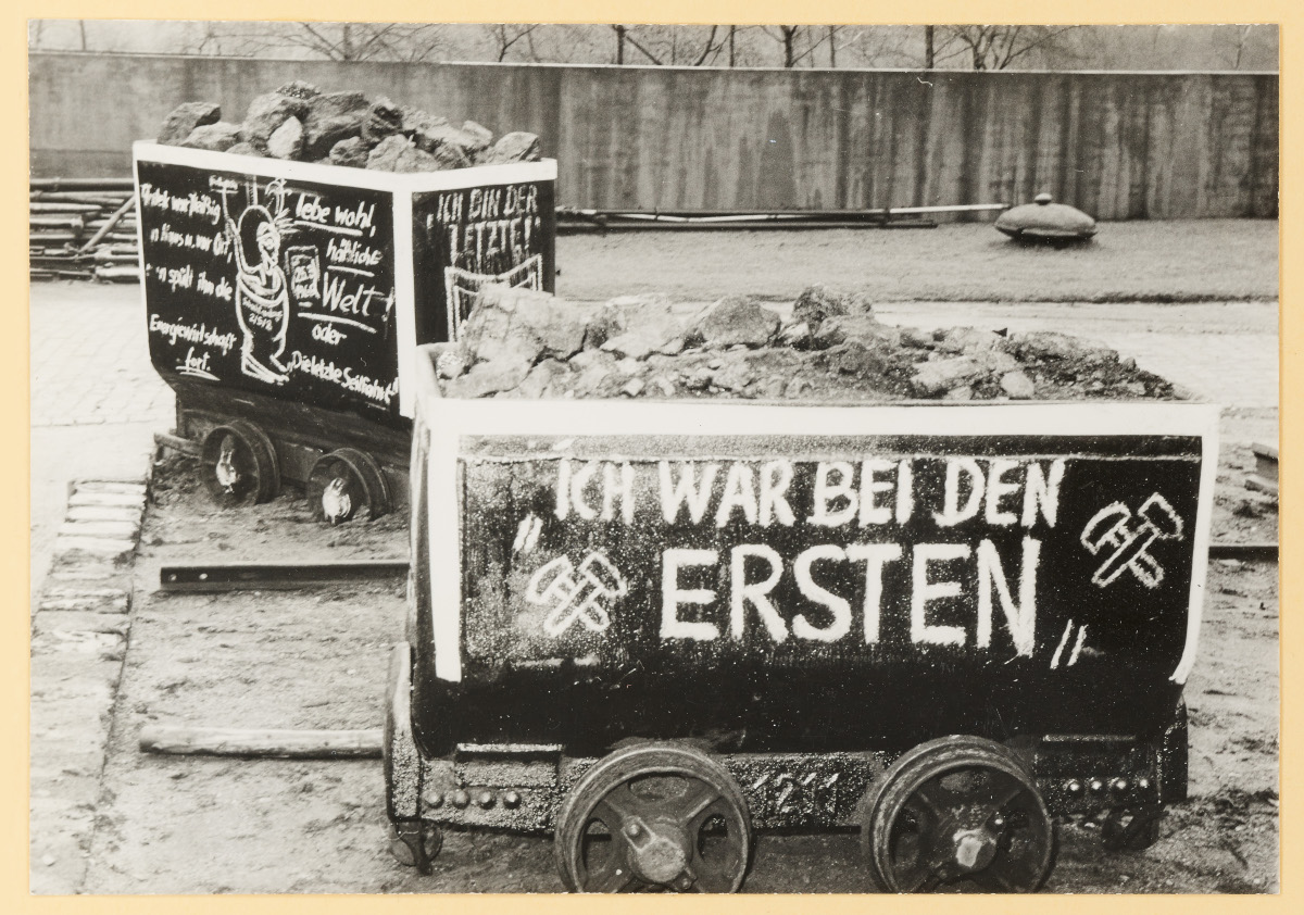 Förderwagen sind typische Objekte der Arbeitswelt unter Tage, zumindest bis in die 1960er-Jahre. Gerade deshalb eignen sie sich für unterschiedliche symbolische Aufladungen. Heute stehen sie – in Vorgärten und Siedlungen – häufig als nostalgische Zeugen der engen Verknüpfung lokaler Nachbarschaften mit dem Bergbau im Ruhrgebiet. Beim hier vorgestellten Objekt des Monats symbolisieren Förderwagen ebenfalls die Arbeit unter Tage und die damit verbundenen Mühen, dies jedoch nicht in nostalgischer, sondern in polemischer Absicht.