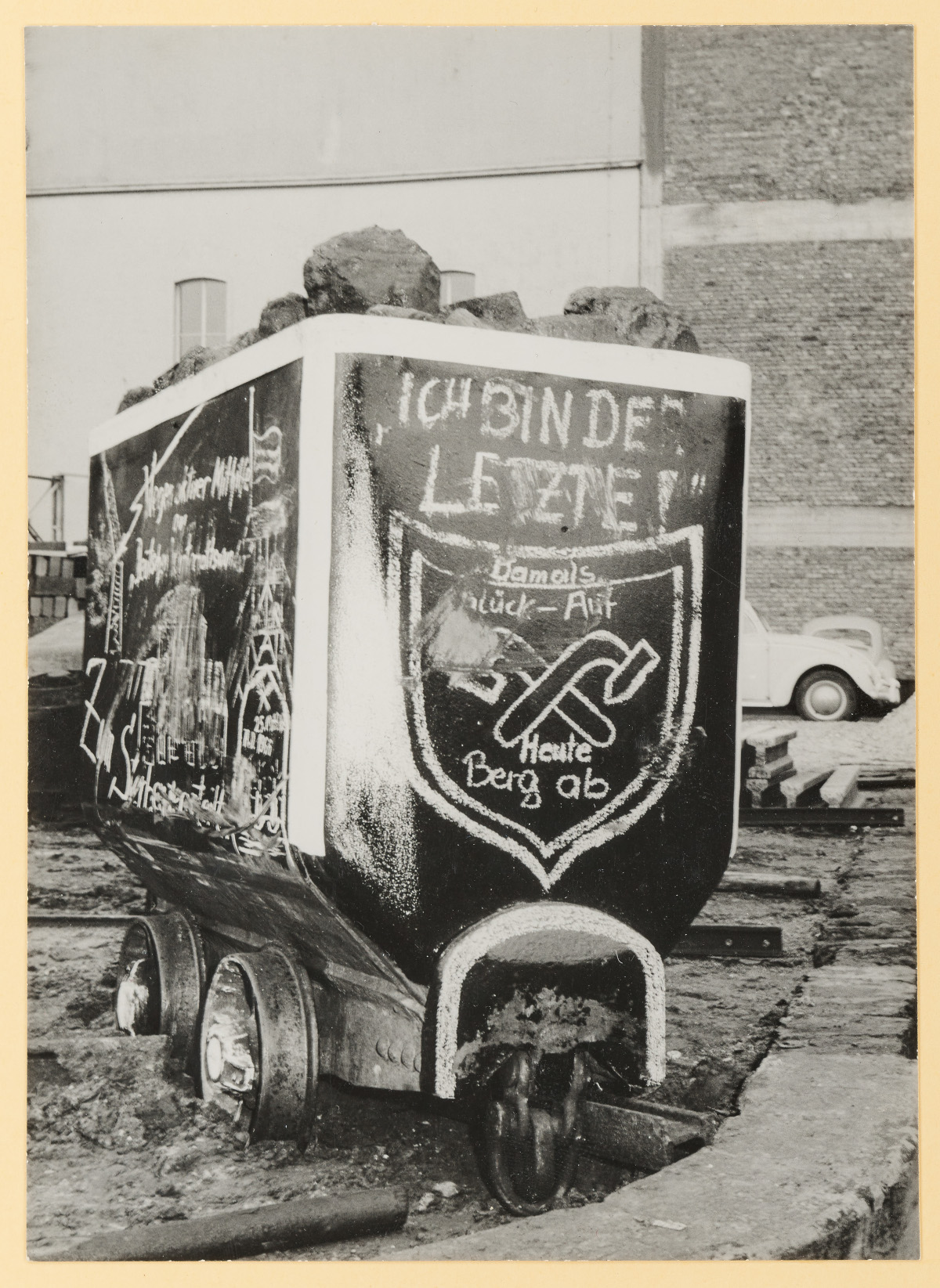 Verzierte und geschmückte „letzte“ Förderwagen als Symbole von Fördereinstellungen und Abschied vom Werk finden sich häufig in der bildlichen Überlieferung zur Stilllegung von Schachtanlagen. Beispielhaft sei auf ein Bild von der letzten Schicht der Zeche Helene in Essen verwiesen (montan.dok 027300225001), die im Juli 1965 ihren Betrieb einstellte. Hier sind die beiden letzten Wagen mit Eichenlaub geschmückt, mit Schlägel und Eisen sowie einer Grubenlampe verziert und bilden das Zentrum einer feierlichen Zusammenkunft mit Betriebsleitung und Presse anlässlich der Schließung des Bergwerks. Die Verzierungen der Dahlbusch-Förderwagen wirken dagegen eher wie polemische Kommentare zur Stilllegung als dass man sie in eine Feierstunde hätte einbauen können. Und im Gegensatz zu den schön gearbeiteten bergmännischen Symbolen auf den Wagen der Zeche Helene, deren Ausarbeitung offensichtlich von der Werksleitung in Auftrag gegeben worden war, handelt es sich bei den Kreidezeichnungen und -aufschriften von Dahlbusch deutlich um Arbeiten eher ungeübter Hände. Umso auffälliger und bedeutungsvoller erscheinen sie. Zwar werden auch hier traditionelle Motive wie Schlägel und Eisen und der Glückauf-Gruß aufgenommen, doch werden sie in der konkreten Verbindung aus Text und Bild zur Kritik an einer ausbleibenden politischen Unterstützung des Bergbaus und vor allem der Bergleute angesichts der Krise der Industrie.