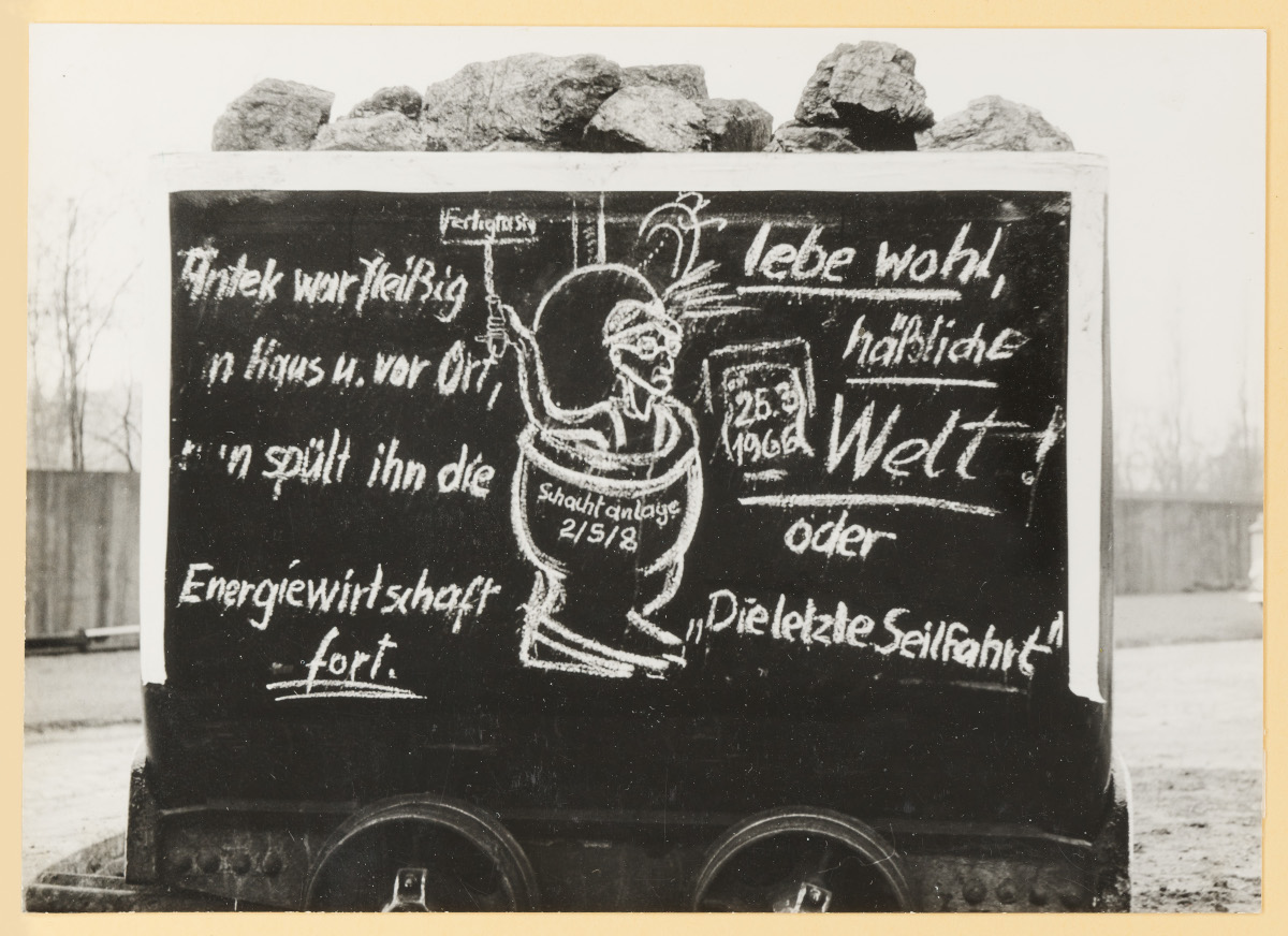 Das aktuelle Objekt des Monats scheint eigentlich für sich zu sprechen – und gibt doch auch Rätsel auf. Es handelt sich um eine Reihe von Fotografien (montan.dok 023600029000), die 1966 im Betriebshof des Deutschen Bergbau-Museums Bochum aufgenommen wurden. Abgebildet sind aus verschiedenen Perspektiven zwei Förderwagen der Zeche Dahlbusch in Gelsenkirchen, die anlässlich der Stilllegung des Bergwerks am 25. März 1966 mit Karikaturen, Gedichten und Slogans verziert wurden und offenbar im Rahmen von Protestaktionen gegen die Zechenschließung Einsatz fanden.